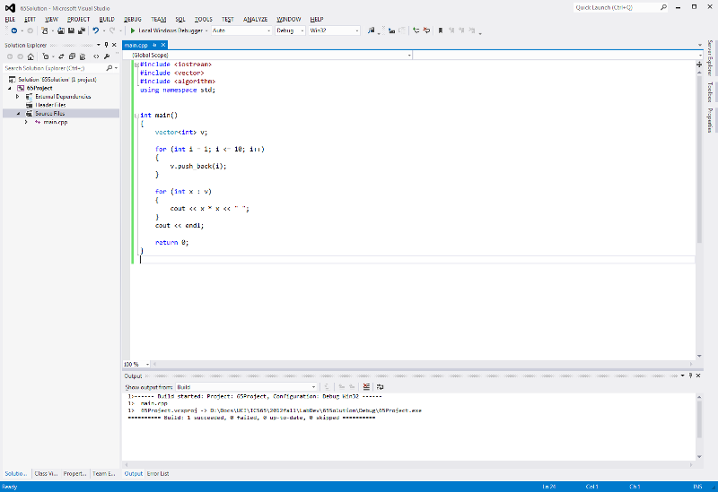 Along the left side of the window is the Solution Explorer, which, for our purposes, is a list of all of the source and header files in your program. The largest portion of the window is devoted to viewing and editing your code, providing a fairly straightforward and typical code editor. Along the bottom of the window is the Output area, which will show you the output generated by compiling your program or performing a search.